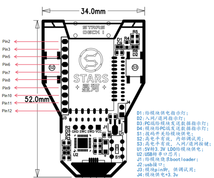 該產(chǎn)品采用郵票孔卡扣設(shè)計(jì),便于模塊安裝、卸取,兼具穩(wěn)定牢固,輕量便攜;電源部分采用5V轉(zhuǎn)3.3V的USB供電,并配有撥碼供電開關(guān)、可接入PC或HUB使用;雙按鍵,輕松實(shí)現(xiàn)各類調(diào)試,入網(wǎng)、程序測試,燒錄工作。